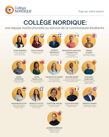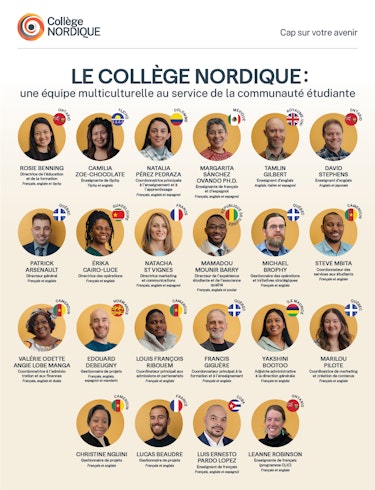 Notre équipe de l’expérience étudiante soutient la communauté étudiante tout au long de son parcours au Collège, en veillant à lui offrir des services adaptés, un environnement d’apprentissage accueillant et un suivi personnalisé, imprégné du caractère nordique.