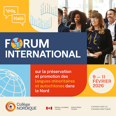 Du 9 au 11 février 2026, le Collège Nordique, en collaboration avec des organismes et des membres communautaires, tiendra le Forum international sur la préservation et la promotion des langues autochtones et minoritaires du Nord. Cet événementrendu possible grâce au soutien financier des Affaires mondiales Canada et Canada Arctique, rassemblera des personnes issues des milieux communautaires, éducatifs et de la recherche afin d’échanger sur des solutions concrètes pour soutenir la vitalité linguistique en contexte minoritaire.